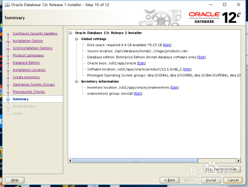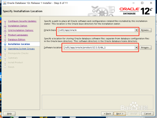 安装目次位置选择,注重确定$ORACLE_BASE 变量和$ORACLE_HOME 变量与情况变量连结一致,下一步。