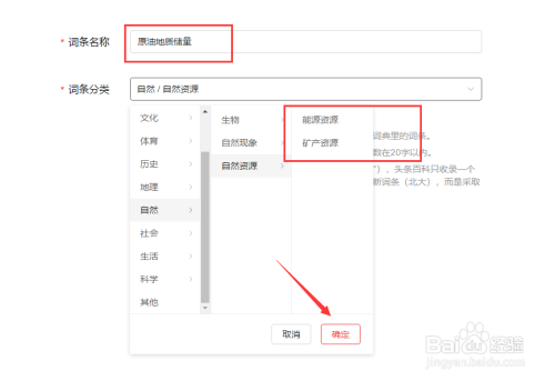 第五:选择【词条名称】和【分类】带点击确定按钮。