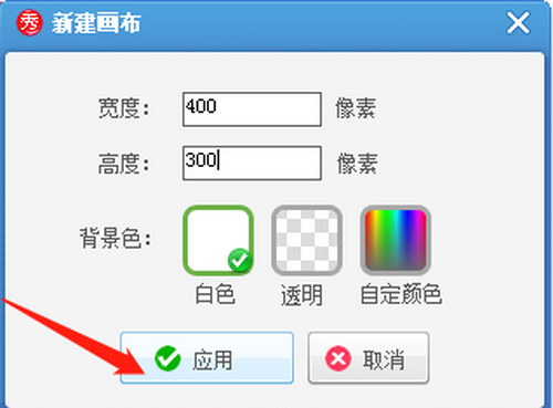 打开美图秀秀软件,点击“新建”,弹出“新建画布”对话框。宽、高、布景色,点击“应用”