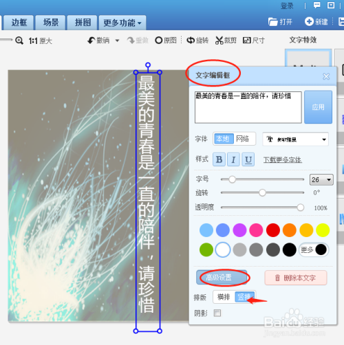 1.点击文字--输入文字 2.弹出“文字编纂框”,输入文字,选择文字颜色,然后高级设置,选择竖排