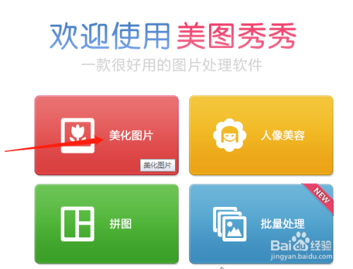 1.下载美图秀秀软件 2.打开软件,在软件首页点击“美化图片”。
