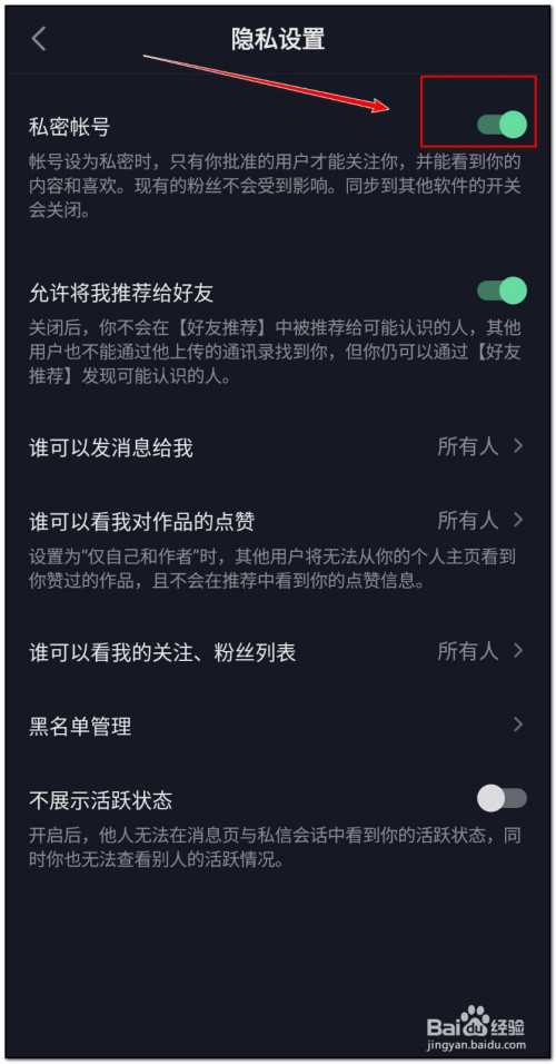 将私密账号后面按钮开启,即可在有人在存眷您账号时,颠末您验证核准才能存眷