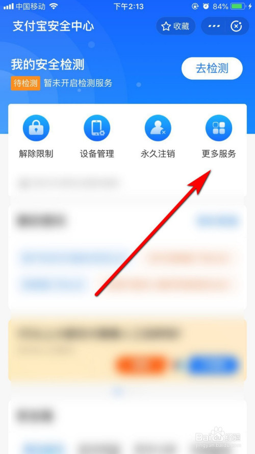 在支付宝平安中间页面中,找到更多办事选项,点击进入更多办事。