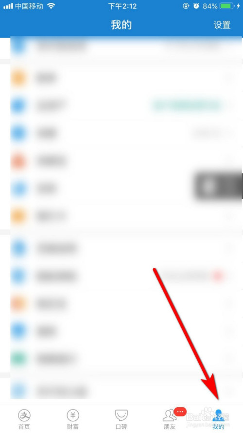 起首我们进入支付宝,App,点击右下角我的,如下图中箭头所指的位置。