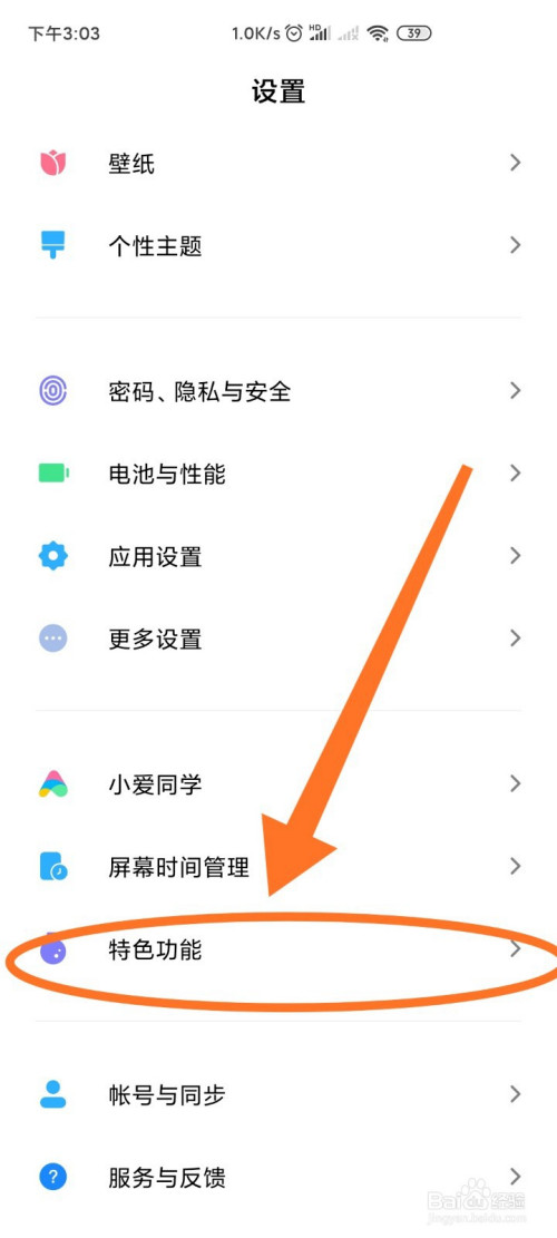 在设置中标的目的下翻,找到特色功能,点击进入