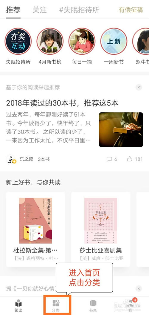 进入网易蜗牛念书首页,点击下方栏目中的“分类”