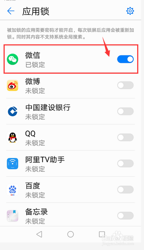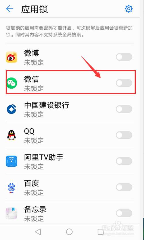 点击打开需要开启应用锁应用后面的按钮开关,灰色酿成蓝色。