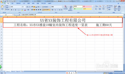 起首在第一行归并单位格输入装饰公司名称——在第二行归并单位格并输入工程名称与施工期。