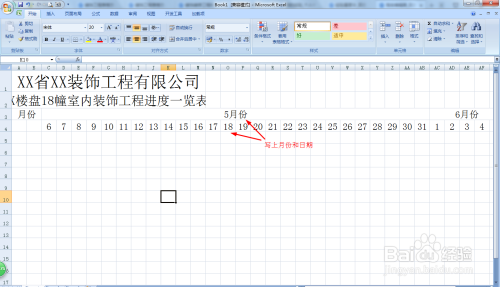 接着在第三行A3:B3归并单位格并输入:月份——其它单位格按照日期数归并且写上月份名称——第四行写上日期。