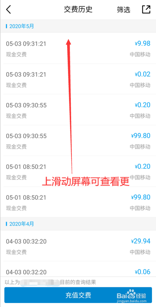 进入“交费汗青”页面后,即可看到交费记实。如要查看更多记实,可上滑屏幕。见下图