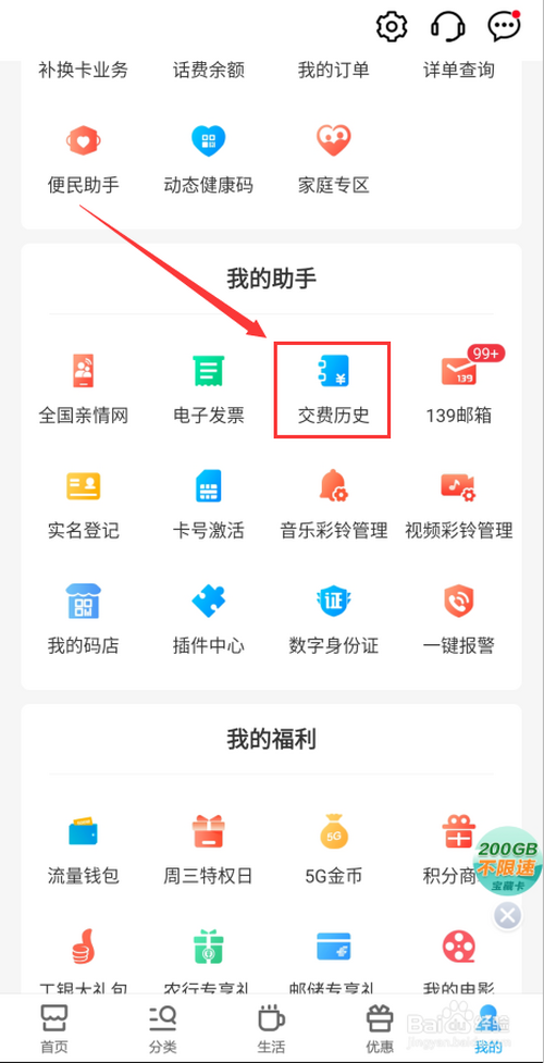 在“我的助手”下,找到“交费汗青”并点击。见下图