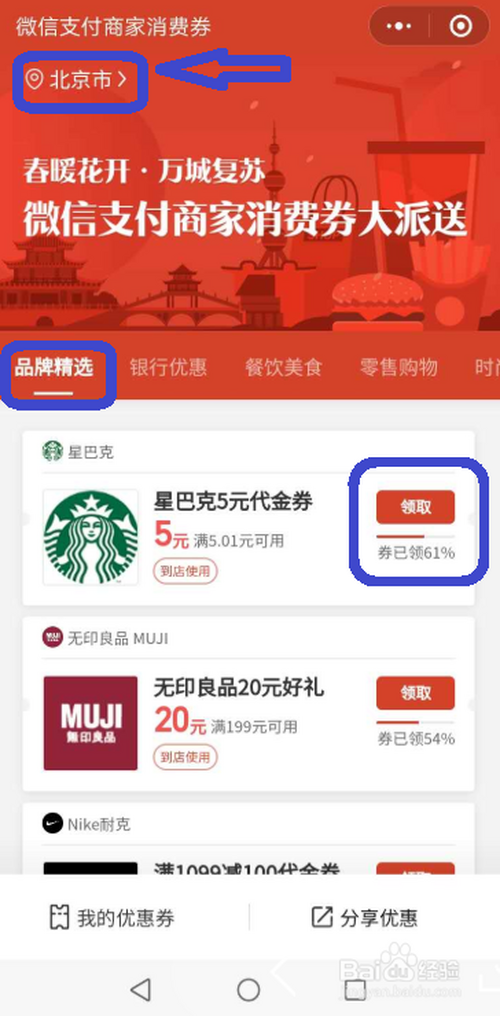 这时辰会呈现【微信支付商家消费券】的具体页面,然后把定位选择【海说神聊京市】,然后券的类型选择【品牌精选】,如下箭头所指,这时辰我们可以领取星巴克代金券,无印良品代金券 等