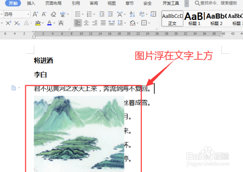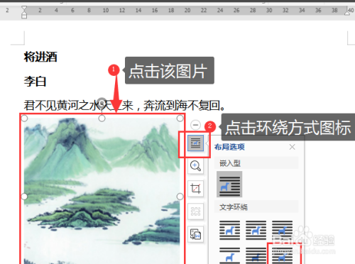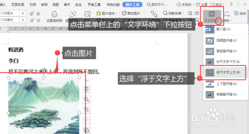 法二:点击图片,再点击“文字环抱”下拉按钮,“浮于文字上方”。如图所示。