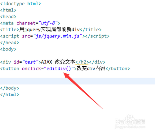 在test.html文件中,利用button标签建立一个按钮,给button绑定onclick点击事务,当按钮被点击时,执行editdiv()函数。