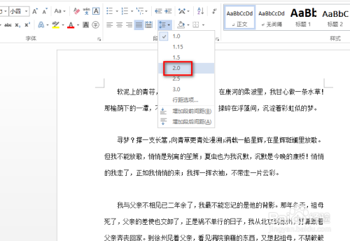 接着,在“起头”选项卡下的段落功能区再次调整行间距,具体如图所示:
