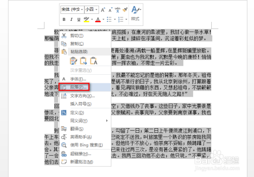 起首,全选文档内容,鼠标右键,在呈现的下拉菜单中,点击“段落”,具体如图所示:
