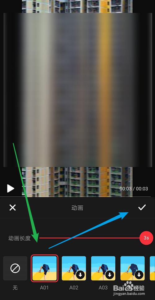 ③选中视频片段,点击【动画】,选择一个动画,点击【√】即可完当作操作。