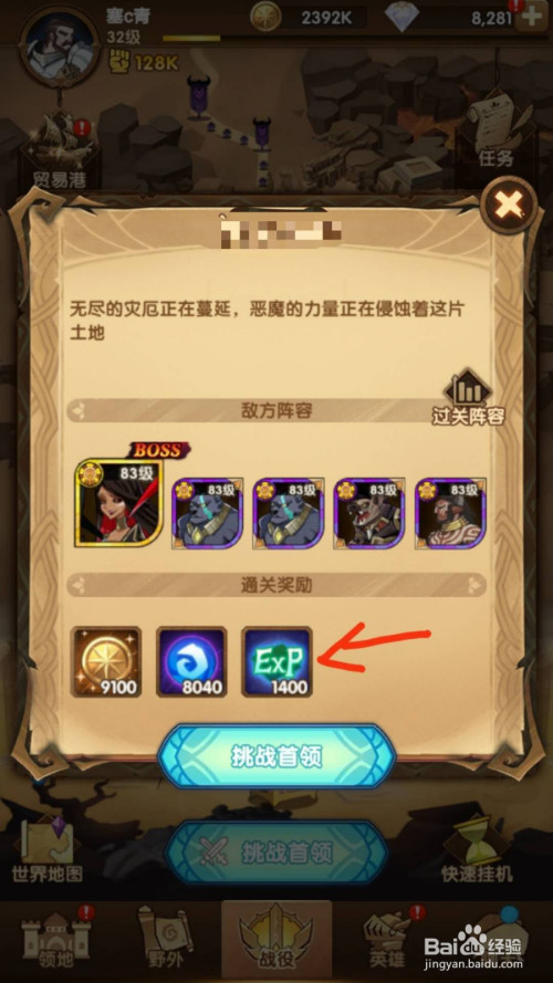 打开手机后进入剑与远征游戏的6-33关,点击底部的“挑战首级”