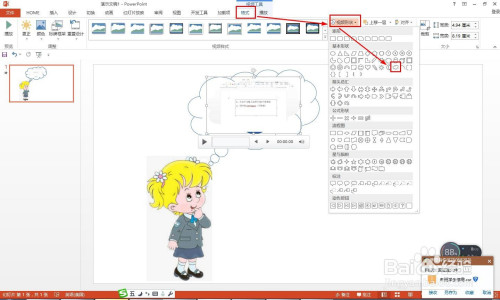 点击缩小视频画面——点击视频东西的格局——视频外形选择云形——把它置于云形标注的底层。