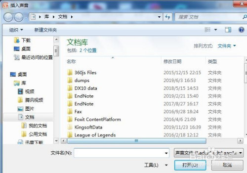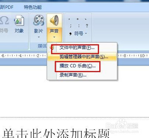 单击菜单栏“插入”,在“媒体剪辑”功能栏中点击“声音”,打开下拉菜单,选择“文件中的声音”。。