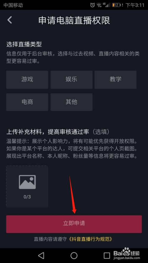 进入申请电脑直播权限界面,点击“当即申请”按钮。