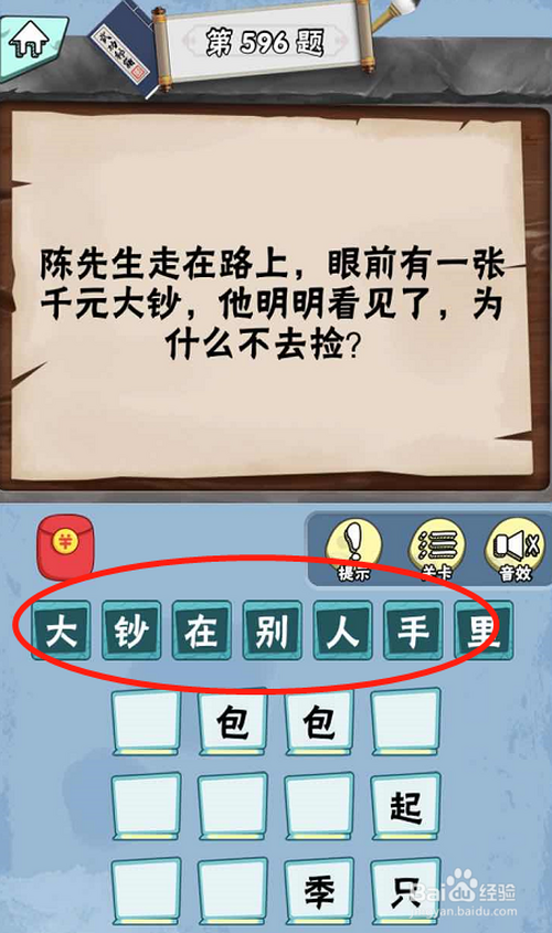 脑子急转弯达人游戏Lv6绝代奇才第596关内,提问陈师长教师走在路上,面前有一张千元大钞,他明明看见了,为什么不去捡。