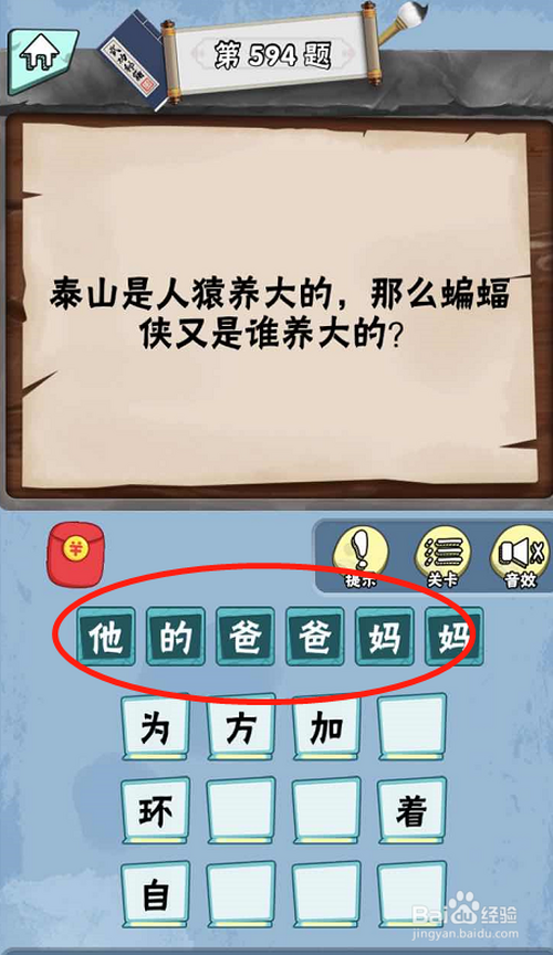 脑子急转弯达人游戏Lv6绝代奇才第594关内,提问泰山是人猿养大的,那么蝙蝠侠是谁养大的。