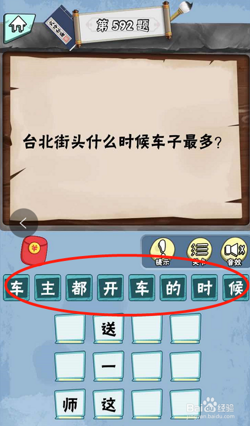 脑子急转弯达人游戏Lv6绝代奇才第592关内,提问台海说神聊陌头什么时辰车子最多。