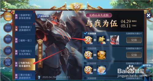 第5步在勾当页面的与我为伍,兑换丰硕好礼中可以看到圆桌,骑士的兑换体例是20个55开开黑徽章和20个五5守护星就可以兑换