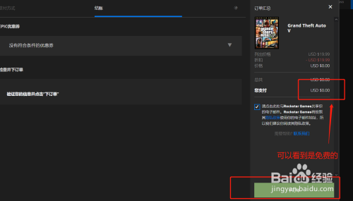 然后我们就会弹出一个确认的界面,在这个界面里我们可以看到,确实是免费的,而且仍是豪华版的GTA5。点击如下图红框所示的按键。我们就可以领取到免费的GTA5了!以上就是小编给大师分享的epic若何领取免费的GTA5的经验,最后祝大师游戏兴奋!