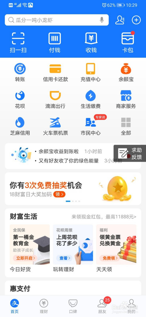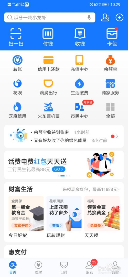 我们来到支付宝的本家儿界面,然后鄙人方的横幅位置滑动一下。