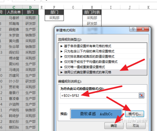选择利用公式确定要设置的单位格。然后公式的话就是要D列内容等于所选部分内容。 所以我们输入 =$D2=$F$2