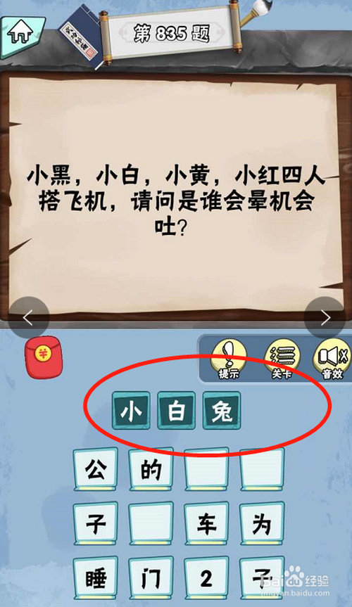 脑子急转弯达人游戏Lv6绝代奇才第835关内,提问小黑、小白、小黄和小红四小我搭飞机,谁会晕机吐。