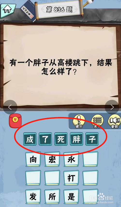 脑子急转弯达人游戏Lv6绝代奇才第836关内,提问有一个胖子从高楼跳下去,成果怎么样。