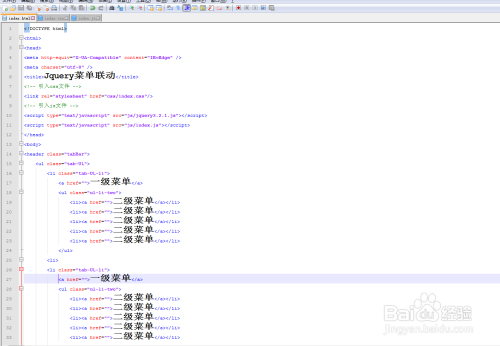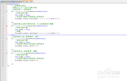 打开Index.js进行菜单联动的js动态事务绑定。利用jqeury方式来实现该功能的实现,利用jquery中的hide()和show()方式来视线二级菜单的显示和埋没的功能。