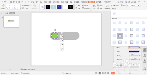 选中圆形,鼠标右键“设置对象格局”,在右侧弹出的属性设置窗格中,选择外形选项,点击结果,在发光中选择一个合适的结果。