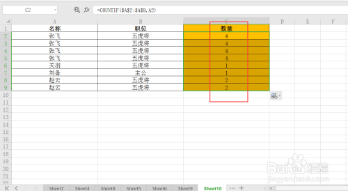若是感受数据欠好看,我们可以将名称列去重,放在新建列中,在从头输入公式=COUNTIF($A$2:$A$9,C2),计较成果如下。