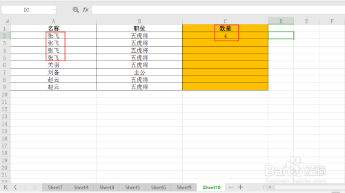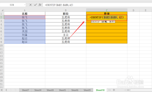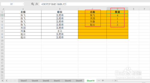 在数据列中输入计较公式=COUNTIF($A$2:$A$9,A2),计较不异名称的数目;