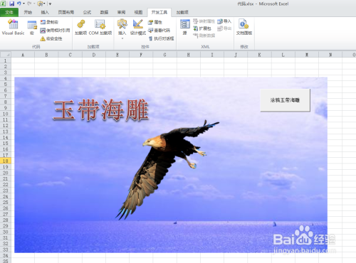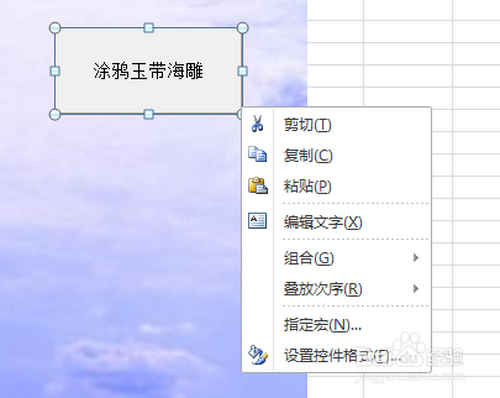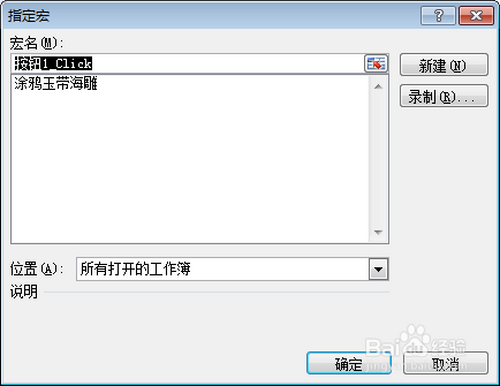 7.将按钮控件定名为“涂鸦玉带海雕”,然后点击右键,选择“指定宏”选项。