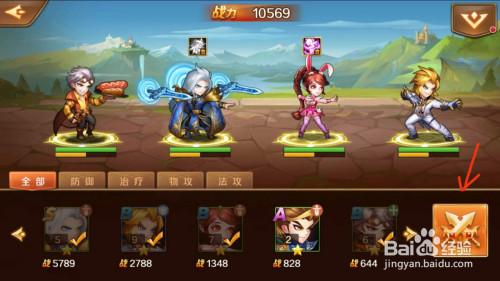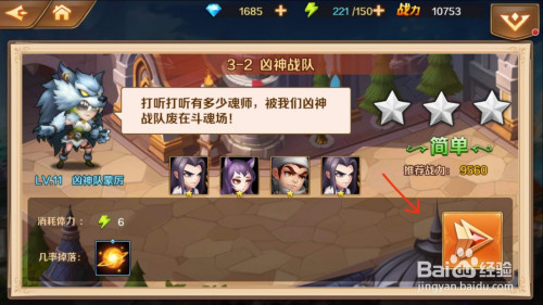 进入关卡后,在界面右侧可以看到系统保举的战力,然后我们点击右下角的箭头按钮
