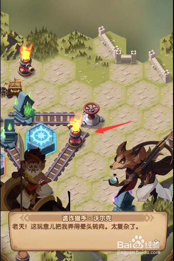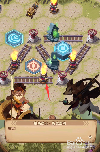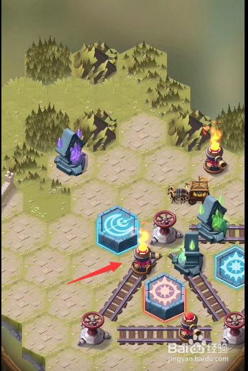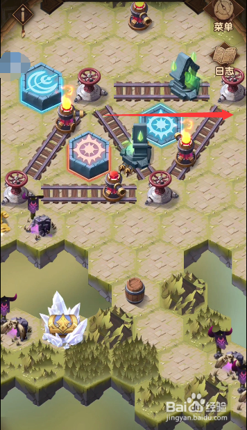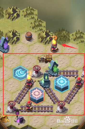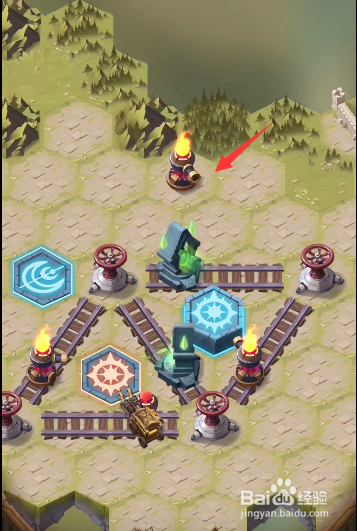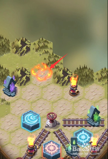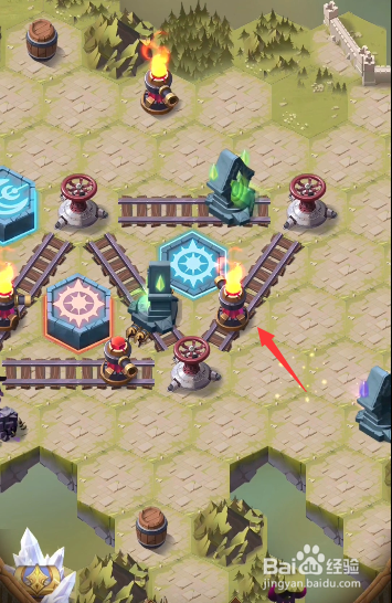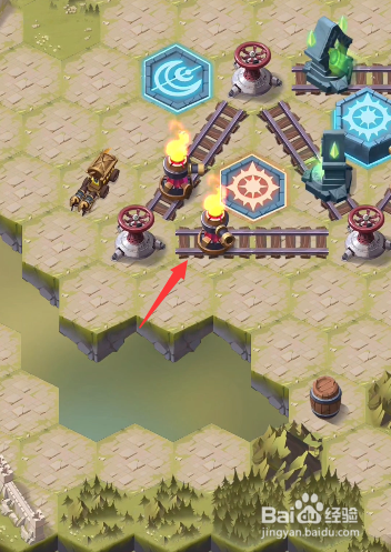 回到之前的轨道处,将轨道上道具挪动当作图示样式,发射右下侧的炮台,打失落左上角处的火桶,清失落沿线的据点。