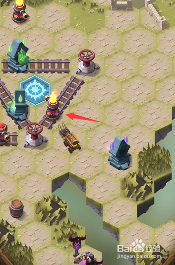 继续将轨道调试当作图示的样式,点击图示处的炮台,打失落右侧的火桶。