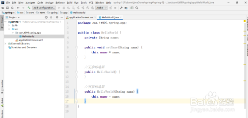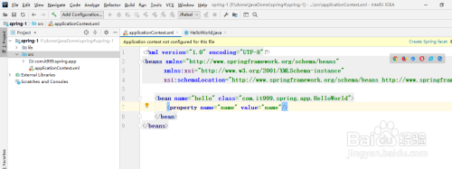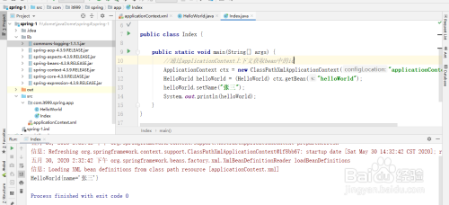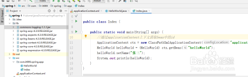 再到com.it999.spring.app中建立一个Index的文件,再文件中供给java的本家儿函数main方式,利用spring中的上下文获取HelloWorld的中name,并给name设置一个值