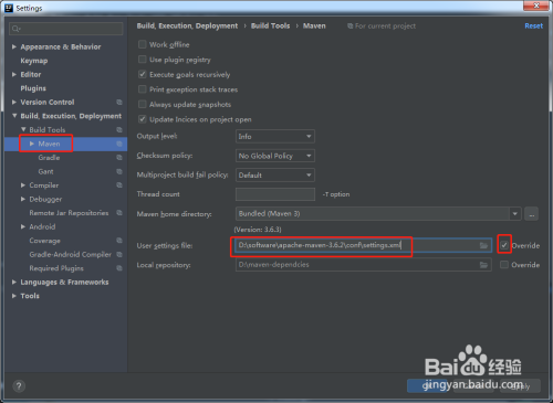 2、可在如下设置栏点窜为当地安装的Maven软件、设置装备摆设文件和当地仓库。