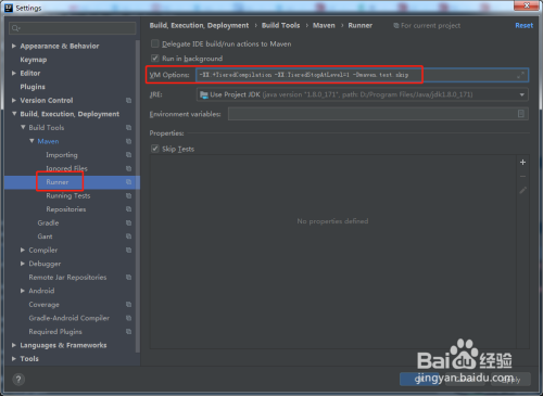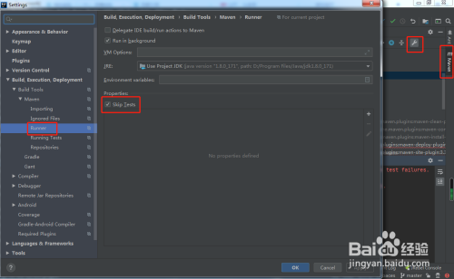 3、设置装备摆设跳过测试代码的编译号令,结果同: -Dmaven.test.skip=true;