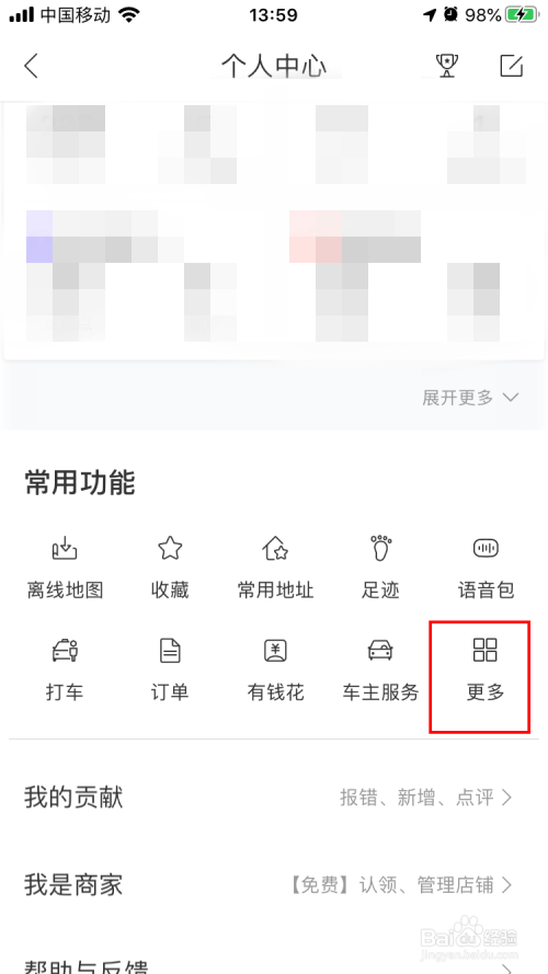 3、在小我中间下拉找到“常用功能”,在点击常用功能下方的”更多“