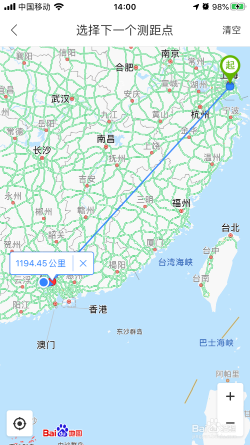 进入了测量两地距离的页面了,先找到上海市,然后点击一下确定起点,然后在手指缩小地图找到广东省,在广东省内(就以广州为例)再点击一下,一条显示两地距离的直线就呈现了。
