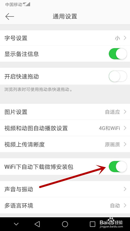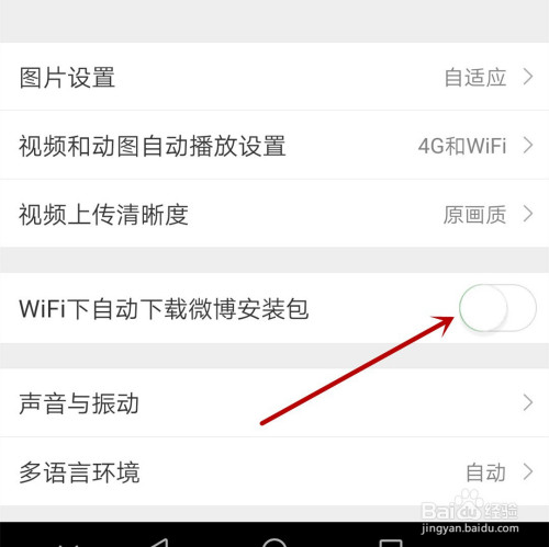 这时可以看到底部有一个【wifi下主动下载微博安装包】,然后点击它旁边的绿色开关。