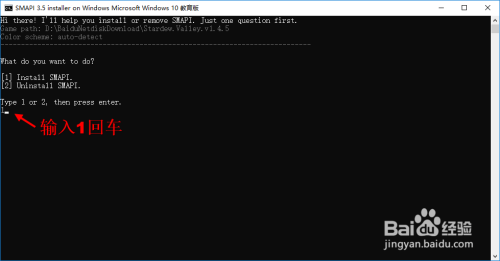 粘贴完当作后,输入数字1并按回车键,数字2为卸载smapi选项。