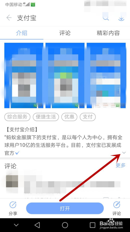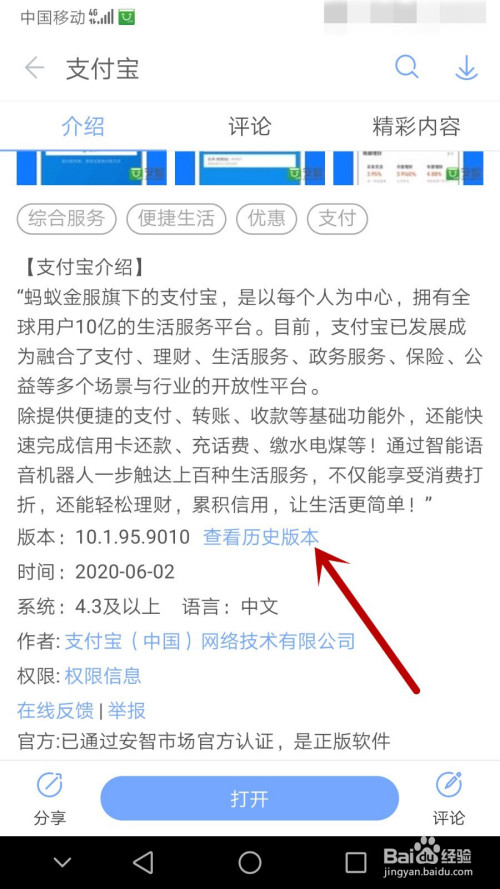 直接点击支付宝进入具体界面,跟着在【支付宝介绍】下,点击下图箭头指标的目的的‘v’。